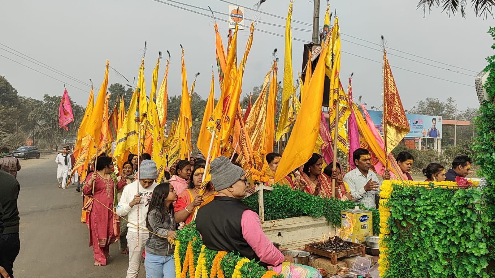 कुल्टी: चिरकुंडा से आइ तीन बाण धारी की निसान यात्रा में शामिल लगभग 400 लोगों ने पैदल चल कर नियामतपुर स्थित श्रीश्याम मंदिर में निसान अर्पण किए। निसान यात्रा आंरभ होने के पूर्व सभी निसान धारियों ने चिरकुंडा स्थित दादी मंदिर में विधिवत मंत्रोचारण के माध्यम से निसान का पूजन किया गया। रास्ते में बराकर और कुल्टी पुलिस की देखरेख में निसान यात्रीगण चल रहे थे। जिसको लेकर सुरक्षा के पुख्ता इंतजाम किए गए थे।