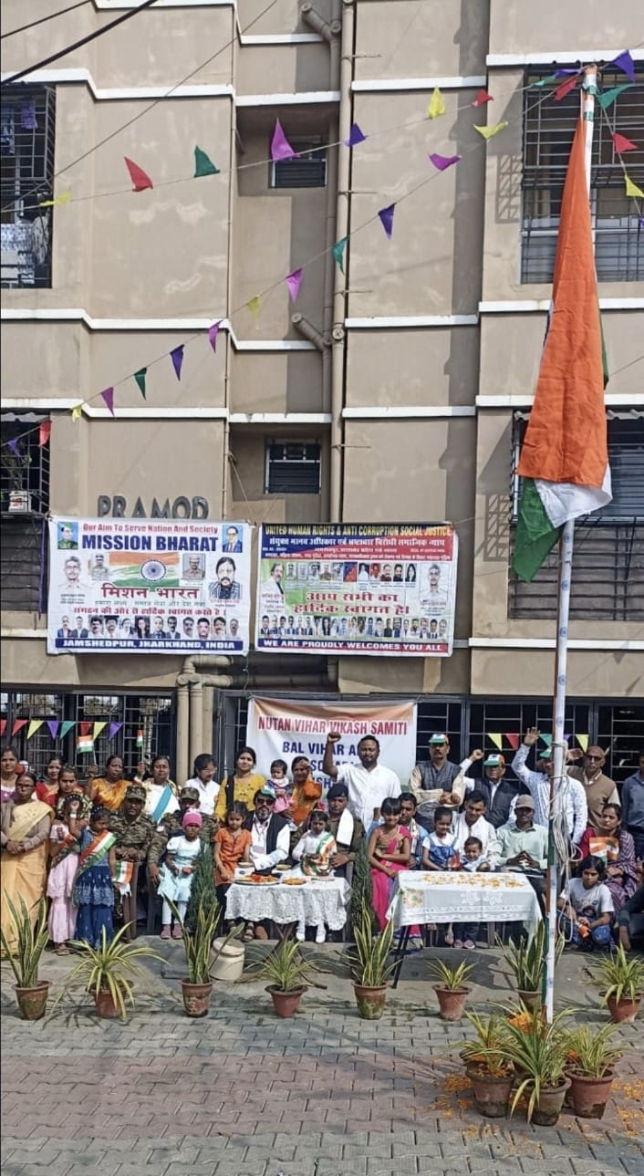 जमशेदपुर: राष्ट्र के 77वें गणतंत्र दिवस के पावन अवसर पर सोनारी स्थित नूतन विहार परिसर में देशभक्ति का अनूठा संगम देखने को मिला। यहाँ यूनाइटेड ह्यूमन राइट्स एंड एंटी करप्शन सोशल जस्टिस, मिशन भारत संगठन एवं नूतन विहार विकास समिति ने संयुक्त रूप से इंडियन आर्मी की टीम और उनके परिवारों के साथ मिलकर बड़े ही धूमधाम से झंडोत्तोलन किया।
