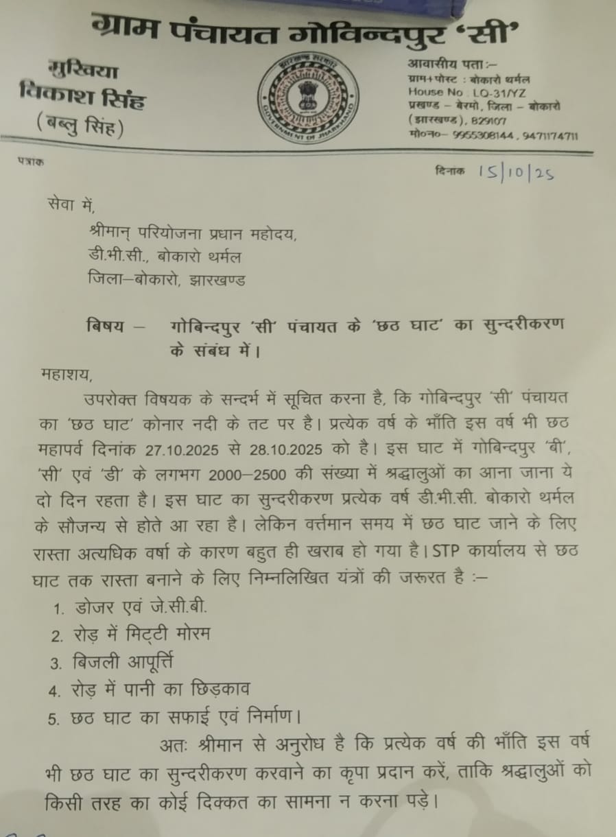 बोकारो थर्मल गोविंदपुर सी पंचायत के मुखिया विकाश उर्फ बबलू सिंह ने डीवीसी को पत्र लिखकर छठ पूजा के मद्देनजर छठ घाट के सुंदरीकरण और आवश्यक व्यवस्थाओं के लिए अनुरोध किया है। मुखिया ने कहा कि छठ पूजा के दौरान लगभग दो से ढाई हजार श्रद्धालुओं के छठ घाट आने की संभावना है, और वर्तमान में छठ घाट तक जाने वाला रास्ता काफी खराब हो गया है। साथ ही मुखिया ने लिखा हैं कि रास्ता बनाने और छठ घाट के आसपास के क्षेत्र को समतल करवाया जाए।