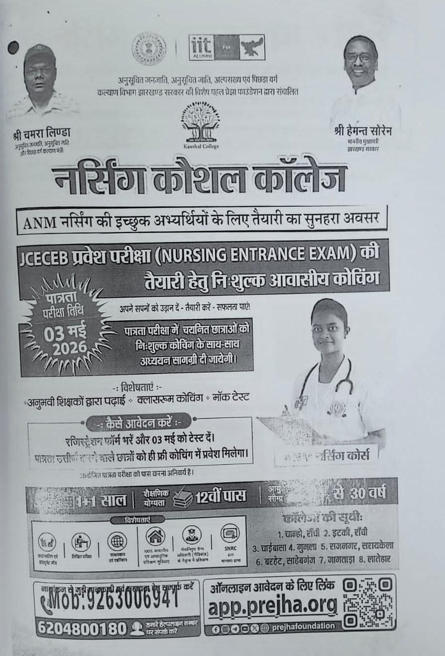 सरायकेला/रांची:- झारखंड सरकार के कल्याण विभाग और प्रेझा फाउंडेशन द्वारा संचालित ‘नर्सिंग कौशल कॉलेज’ ने नर्सिंग के क्षेत्र में करियर बनाने की इच्छुक छात्राओं के लिए एक सुनहरा अवसर प्रदान किया है। राज्य की अनुसूचित जनजाति (ST), अनुसूचित जाति (SC), अल्पसंख्यक और पिछड़ा वर्ग की युवतियों के लिए नर्सिंग प्रवेश परीक्षा की तैयारी हेतु निःशुल्क आवासीय कोचिंग के लिए आवेदन आमंत्रित किए गए हैं।