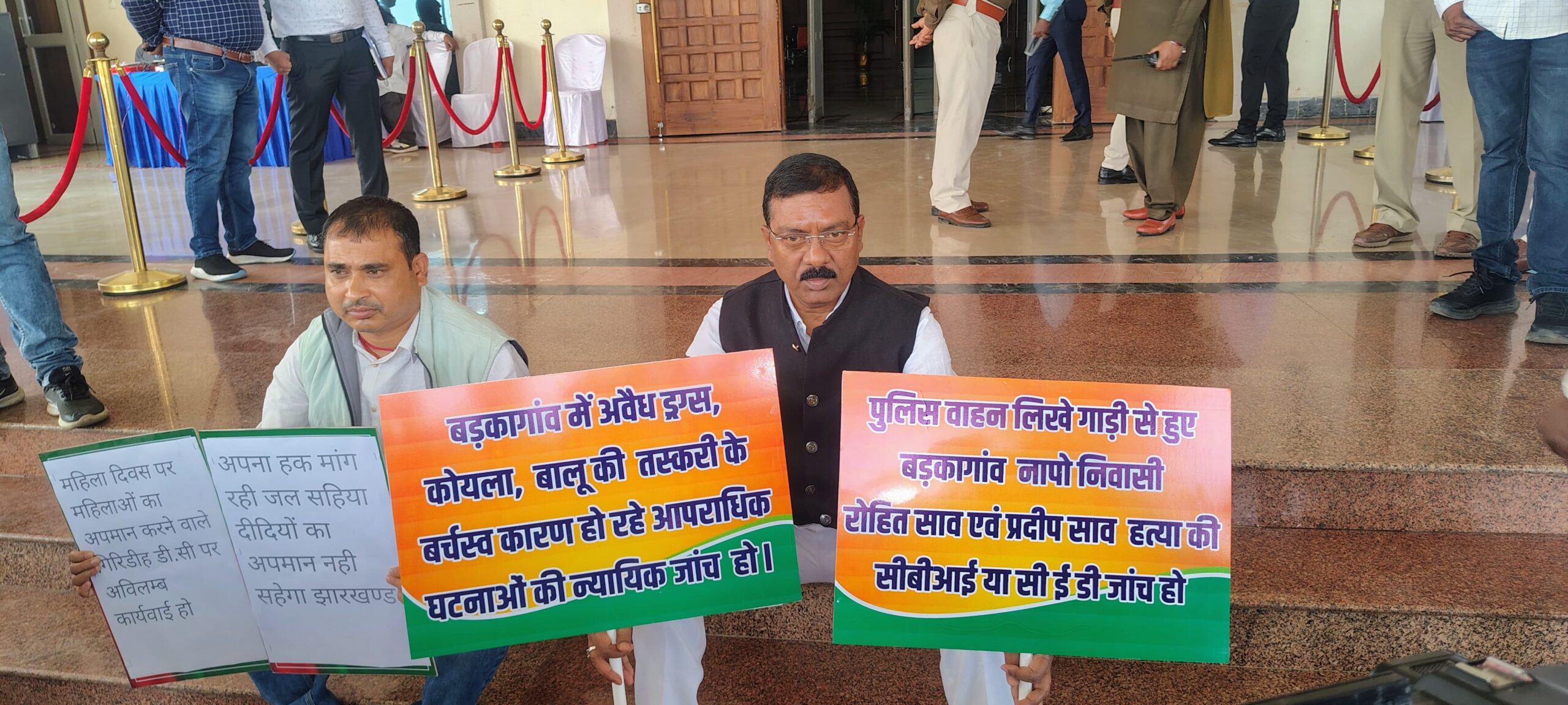 बड़कागांव — झारखंड विधानसभा सत्र के दौरान सोमवार को सदन के बाहर बड़कागांव विधायक रोशन लाल चौधरी ने धरना देकर बड़कागांव विधानसभा क्षेत्र से जुड़े कई ज्वलंत मुद्दों को जोरदार तरीके से उठाया और सरकार का ध्यान इन गंभीर घटनाओं की ओर आकृष्ट कराया। उन्होंने बड़कागांव क्षेत्र में लगातार बढ़ रही आपराधिक घटनाएँ, अवैध तस्करी तथा निर्दोष लोगों पर हो रही कार्रवाई को लेकर गहरी चिंता व्यक्त करते हुए निम्नलिखित मांगों को प्रमुखता के साथ रखते हुए कहा कि बड़कागांव के नापो में हुए दोहरे हत्या कांड में