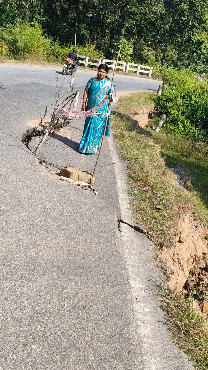 पसरिया जंगल सड़क पर पड़ी धसान , सड़क दुर्घटना को दे रही दावत