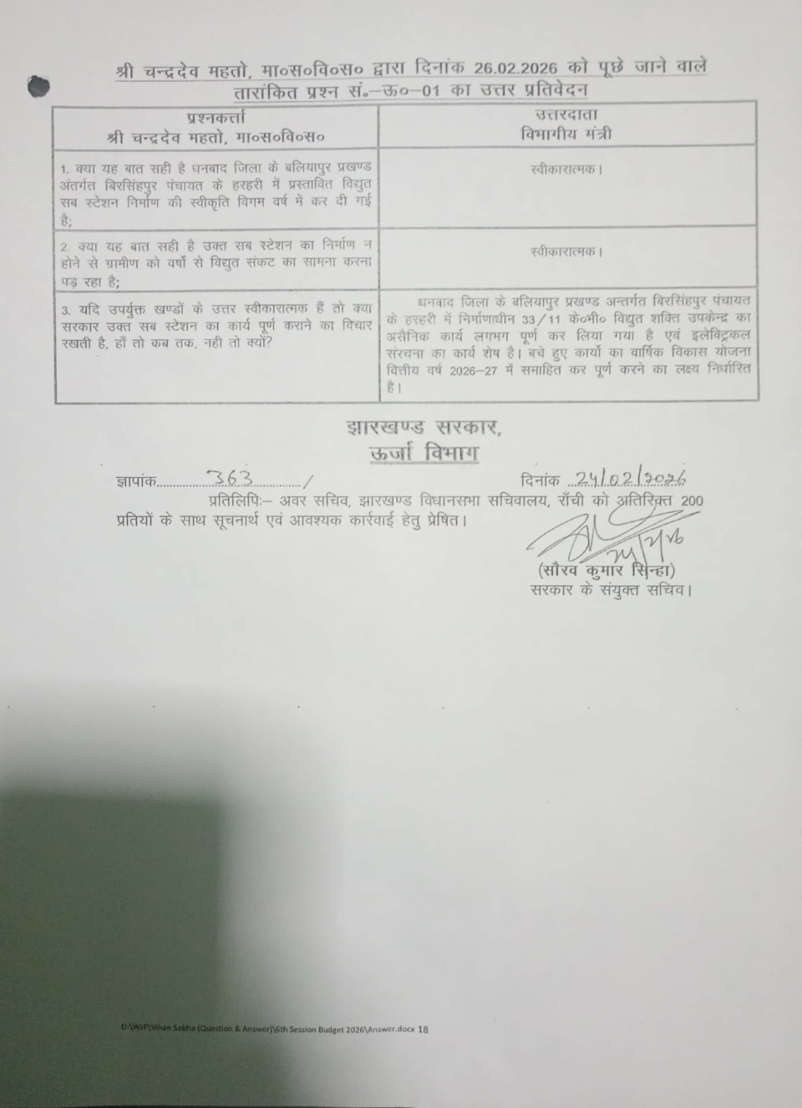 सिंदरी विधायक श्री चन्द्रदेव महतो द्वारा विधानसभा में पूछे गए एक तारांकित प्रश्न के उत्तर में सरकार ने इस परियोजना की प्रगति पर मुहर लगाई है। ऊर्जा विभाग के संयुक्त सचिव, सौरव कुमार सिन्हा द्वारा जारी रिपोर्ट के अनुसार, सब स्टेशन का असैनिक कार्य (Civil Work) यानी भवन और बुनियादी ढांचा लगभग तैयार हो चुका है।