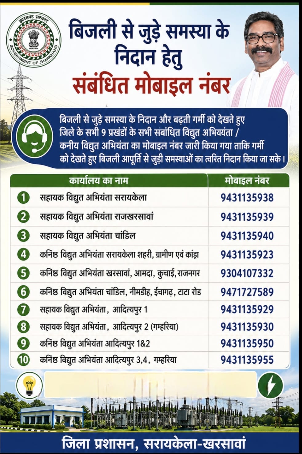 सरायकेला-खरसावां – झारखंड में बढ़ती गर्मी और लू के प्रकोप के बीच बिजली की निर्बाध आपूर्ति सुनिश्चित करने के लिए सरायकेला-खरसावां जिला प्रशासन पूरी तरह मुस्तैद है। आम जनता को बिजली से जुड़ी समस्याओं के त्वरित समाधान के लिए जिला प्रशासन द्वारा सभी 9 प्रखंडों के संबंधित विद्युत अभियंताओं (Assistant & Junior Engineers) के मोबाइल नंबर जारी किए गए हैं।