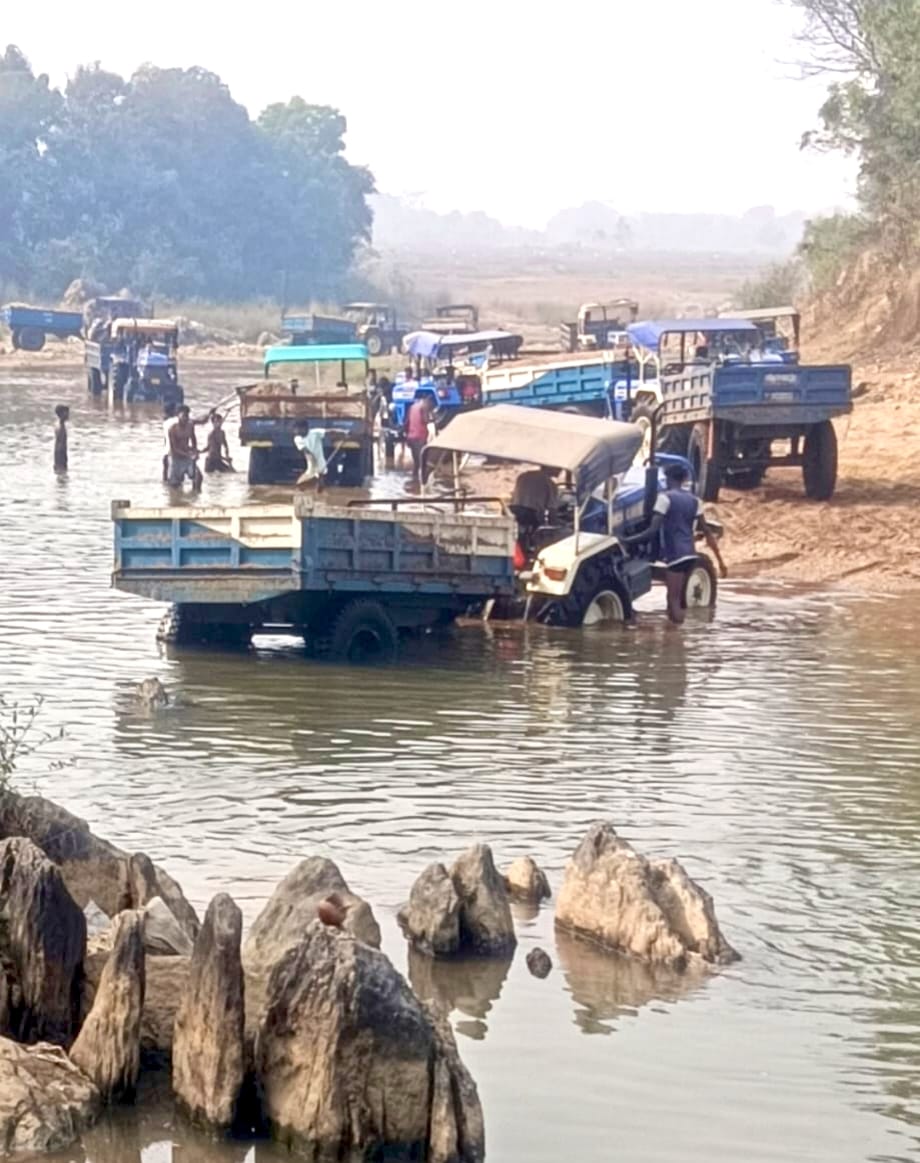 सरायकेला : जिला प्रशासन की सख्ती के बाद भी शांखा नदी से रात के अंधेरे में हो रहा अवैध बालू खनन व परिवहन ।