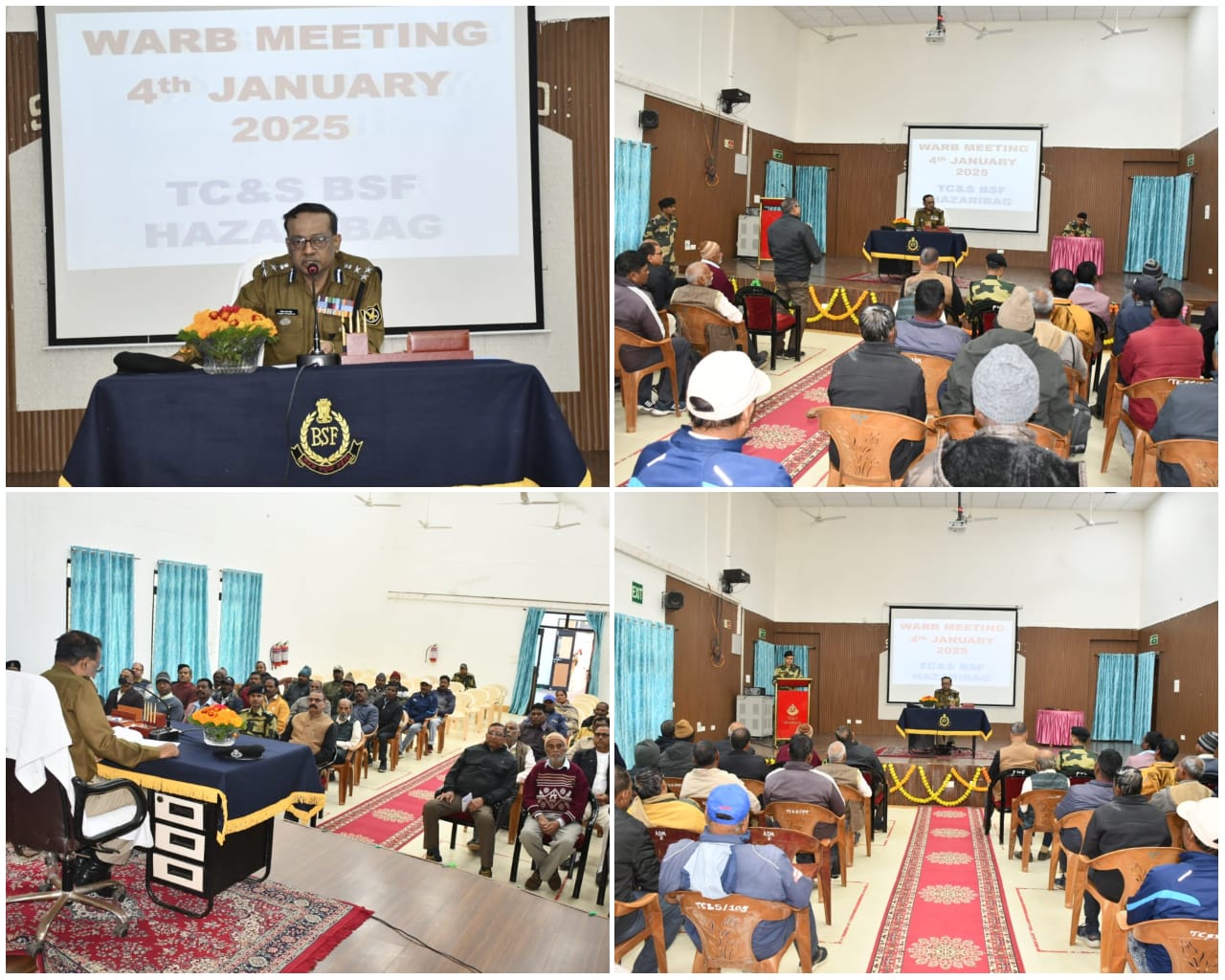 बल मुख्यालय, सीमा सुरक्षा बल, नई दिल्ली के निर्देशानुसार वार्ब (WARB) के तत्वावधान में प्रशिक्षण केन्द्र एवं विद्यालय, सीमा सुरक्षा बल, मेरू परिसर स्थित परिवार कल्याण केन्द्र में दिनांक 04 जनवरी 2024 समय 1100 बजे से झारखण्ड राज्य में रहने वाले सीमा सुरक्षा बल के सेवानिवृत्त कार्मिकों व उनके आश्रितों की पेन्शन व रिटायमेन्ट लाभ में उत्पन्न विसंगतियों के लिए एक ही पटल पर सुनवाई व निवारण हेतु वार्ब मीटिंग का आयोजन किया गया।