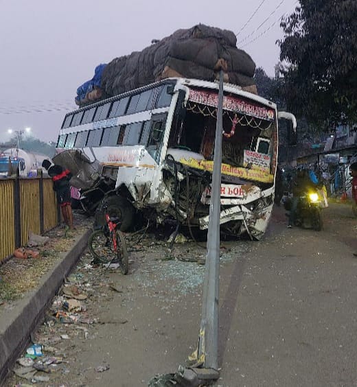 निरसा हटिया मोड़ के पास अनियंत्रित होकर रेलिंग से टकराई ‘शेषनाग लोक’ बस, बिजली पोल भी क्षतिग्रस्त।