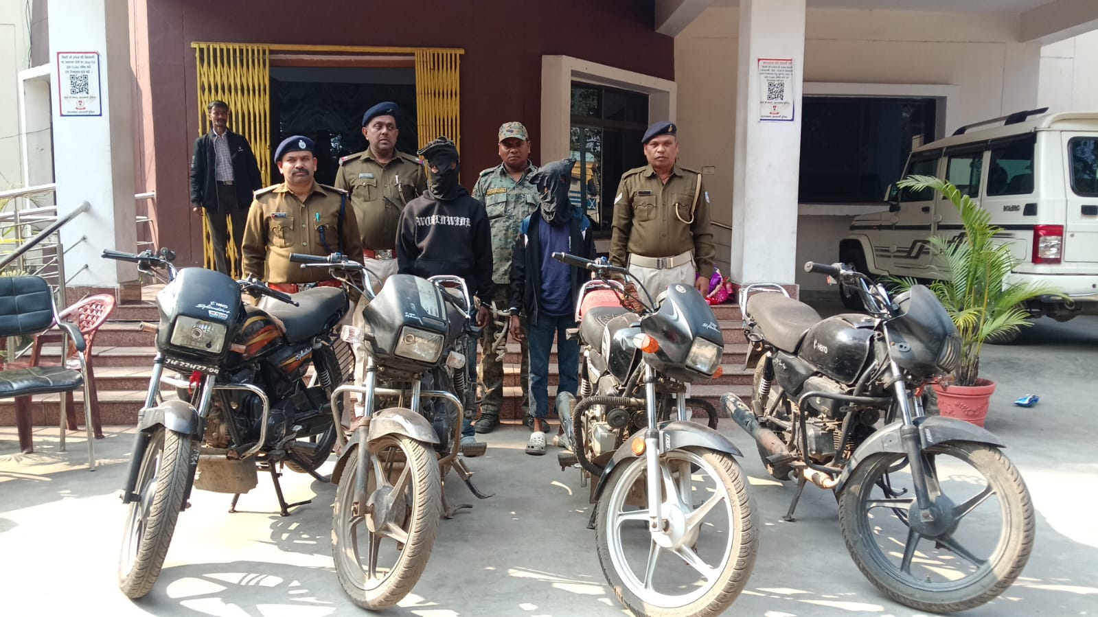 पकड़े गए आरोपियों के पास से चार चोरी के मोटरसाइकिल बरामद किए गए हैं। इन मोटरसाइकिलों की पहचान हिरो होण्डा मोटरसाइकिल नं0-JH22H-2704, एक बिना नम्बर प्लेट का काला रंग स्पेलेण्डर प्लान्स चेचिस नं0-MBLHAW172NHJ18636, एक बिना नम्बर प्लेट का काला रंग का स्पेलेण्डर प्लस चेचिस नं0-MBLHAW123MHB10604 और काला रंग का स्पेलेण्डर प्लस पंजी सं0-JH01EH-6384000, चेचिस नं0-MBLHAW122MHB77393 के रूप में हुई है।