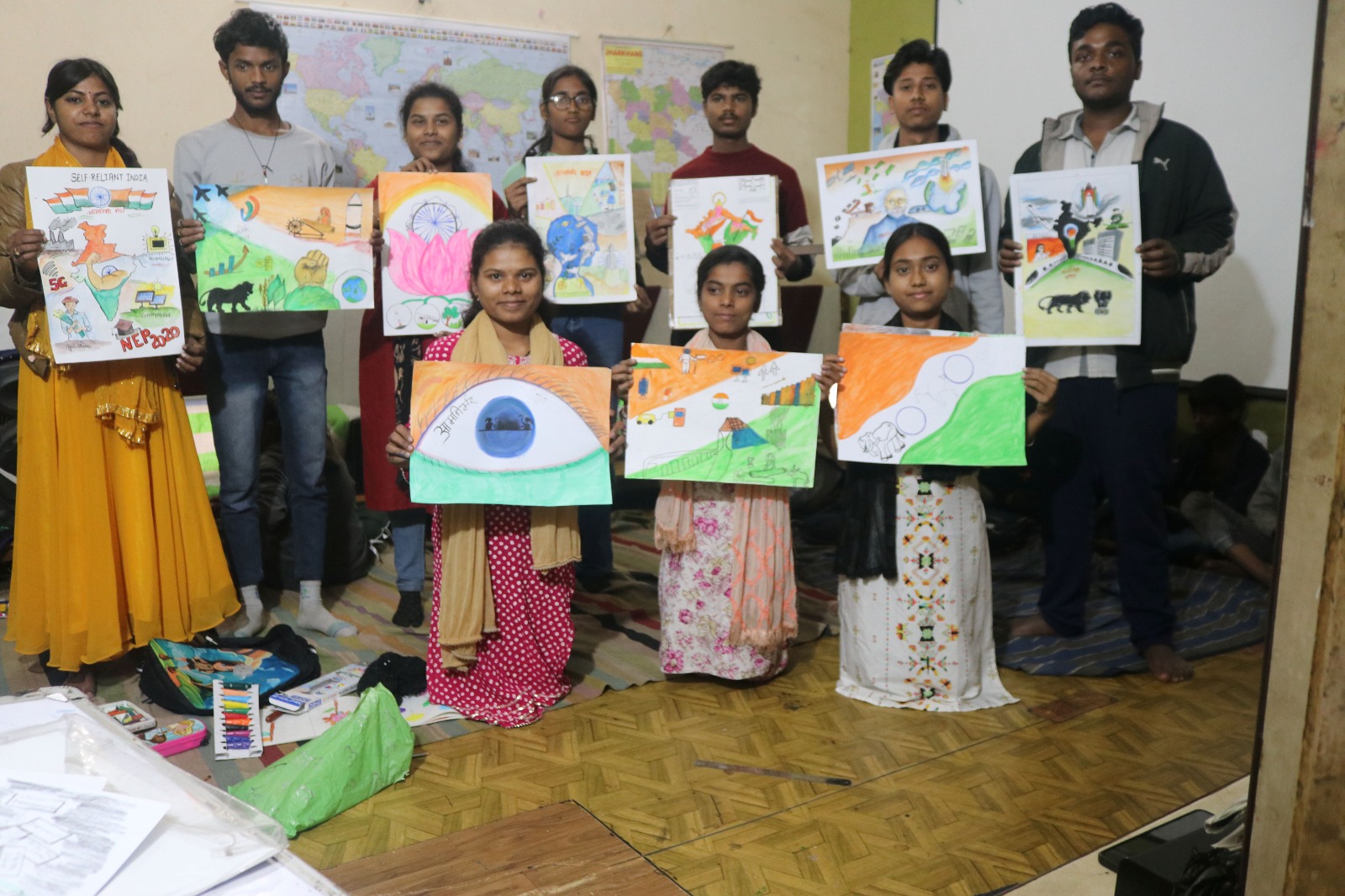 अनेक बच्चें उत्सुकता चित्रकला बनाना देख रहें थे, धनबाद के सुप्रिति सान्याल, आनंद कुमार, सुमित कुमार, साल्वी राज तथा केंदुआ से राजवीर कुमार, प्रेम कुमार, दुर्गा कुमारी, राधिका कुमारी, दुर्गी कुमारी, नंदिनी कुमारी की पेंटिंग संस्था इंस्टीट्यूशन फॉर नेशनल एमिटी द्वारा आयोजित पहला जनवरी 2026 के राष्ट्र के नाम शपथ कार्यक्रम में प्रदर्शित की जाएंगी।