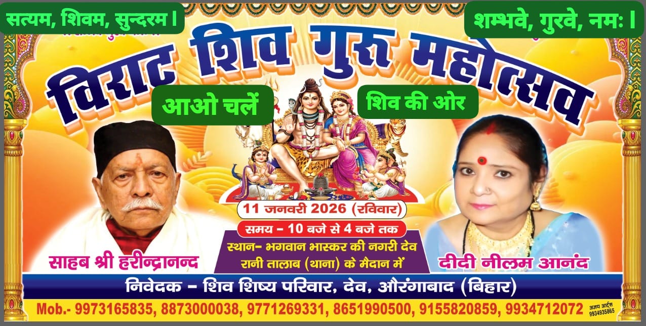 नवीनगर शिवशिष्य परिवार के सदस्य पिन्टू कुमार विधायक ने जानकारी देते हुए बताया कि औरंगाबाद जिला के देव प्रखंड स्थित रानी तालाब मैदान, थाना के निकट दिनांक 11 जनवरी 2026 (रविवार) को एक दिवसीय विराट शिवगुरु महोत्सव का भव्य आयोजन किया जाएगा।