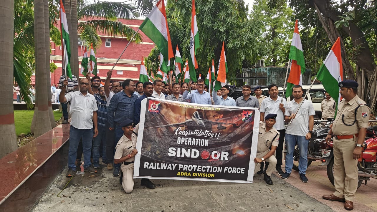 सरायकेला :- “ऑपरेशन सिंदूर” के अंतर्गत आद्रा प्रमंडल डीआरएम कार्यालय, आद्रा में एक भव्य तिरंगा रैली का आयोजन किया गया। इस रैली का नेतृत्व मंडल रेल प्रबंधक श्री सुमित नरूला ने किया, जिसमें सभी शाखा अधिकारी, मंडल कार्यालय के कर्मचारी, रेलवे सुरक्षा बल (RPF) के जवान, स्काउट एवं गाइड के सदस्य आदि उत्साहपूर्वक शामिल हुए।