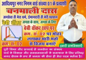 आदित्यपुर। नगर निगम क्षेत्र के वार्ड संख्या 01 से बनमाली दास ने पार्षद पद के लिए अपनी दावेदारी पेश की है। चुनावी मैदान में उतरते हुए उन्होंने कहा कि जनसेवा ही उनका धर्म है और ईमानदारी उनकी पहचान। बनमाली दास बेबी वॉकर चुनाव चिन्ह पर क्रम संख्या 02 से चुनाव लड़ रहे हैं।