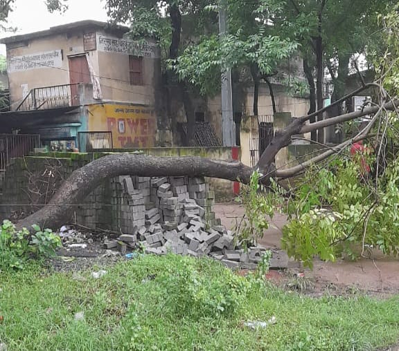 पेड़ एक ईटा पर गिरा जिसके कारण किसी को कोई नुकशान नहीं हूआ!अगर उस जगह अगर इट नहीं रखा होता उस पेड़ के चपेट में कई दुकाने ध्वस्त हो जाता!