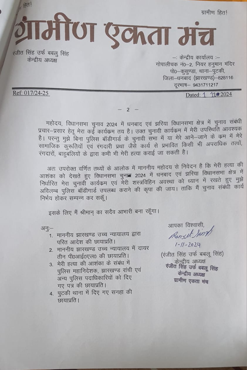 विधानसभा चुनाव के मद्देनजर सुरक्षा गार्ड उपलब्ध कराने को लेकर पत्र लिखा हैं। पत्र में श्री सिंह ने मै मंच का अध्यक्ष साथ-साथ आरटीआई एवं सामाजिक कार्यकर्त्ता हूँ। मैं विधानसभा चुनाव 2019 में तीसरे स्थान पाने वाला उम्मीदवार रह चुका हूँ। मेरे द्वाराा सामाजिक समस्याओं,भ्रष्टाचार के विरूद्ध हमेशा मुखर होकर आवाज उठाते रहता हूँ। मेरे द्वारा माननीय उच्च न्यायालय, झारखण्ड रांची में चार पीआईएल दायर किया गया है। अभी कुछ दिनों पूर्व मेरे द्वारा पुटकी थाना क्षेत्रान्तर्गत गोपालीचक नं0-2 में अवस्थित धार्मिक स्थल महारानी स्थान को बचाने हेतू 24 घंटे का अन्न-जल त्याग आंदोलन किया गया। मेरे द्वारा निरंतर सामाजिक समस्याओं,भ्रष्टाचार के विरूद्ध हमेशा मुखर होकर आवाज उठाने एवं सामाजिक कुरूतियों को दूर करने, रंगदारी प्रथा का विरोध करने के कारण मैं कई ऐसे असामाजिक तत्वों, अपराधियों,रंगदारों, बाहुबलियों के निशाने पर हूँ जो कि मौका पाते ही कभी भी मेरी हत्या कर एवं करा सकते हैं। मेरी सुरक्षा एवं मेरी हत्या की अंदेशा को समझकर माननीय उच्च न्यायालय, झारखण्ड, रांची के द्वारा मेरी सुरक्षा हेतू जिला प्रशासन हथियार का लाईसेंस देने का निर्देश दिया गया। मेरा लाईसेंसी हथियार वर्तमान में विधानसभा चुनाव 2024 के मद्देनजर जिला प्रशासन के निर्देश पर शस्त्रागार में जमा है। जिससे मेरी जान-माल का खतरा वृहद पैमाने पर बढ़ चुका है। मेरे द्वारा पूर्व में पुलिस बॉडीगार्ड हेतू आवेदन भी दिया जा चुका है। साथ ही मेरे द्वारा स्थानीय थाना में अपने उपर खतरा से संबंधित सनहा भी दर्ज कराया जा चुका है। पुलिस द्वारा मुझे बॉडीगार्ड उपलब्ध कराने के संबंध में जांच-पड़ताल कर अपना जांच प्रतिवेदन भी संबंधित अधिकारियों के समक्ष संभवतः प्रस्तुत किया जा चुका है। परन्तु मुझे आज तक पुलिस बॉडीगार्ड उपलब्ध नहीं कराया जा सका है। श्री सिंह ने कहा कि विधानसभा चुनाव 2024 में धनबाद एवं झरिया विधानसभा क्षेत्र में चुनाव संबंधी प्रचार-प्रसार हेतू मेरा कई कार्यक्रम तय है। उक्त चुनावी कार्यक्रम में मेरी उपस्थिति आवश्यक है। परन्तु मुझे बिना पुलिस बॉडीगार्ड के चुनावी सभा में या मेरे आने-जाने के क्रम में मेरे सामाजिक कुरुतियों एवं रंगदारी प्रथा जैसे कार्य से प्रभावित किसी भी अपराधिक तत्वों, रंगदारों, बाहुबलियों के द्वारा कभी भी मेरी हत्या कराई जा सकती है। श्री सिंह ने अपनी जान माल का खतरा बताते हुए अभिलम्ब बॉडीगार्ड उपलब्ध कराने कि मांग कि हैं। जिससे वें निर्भीक होकर चुनाव प्रचार कर पाए।
