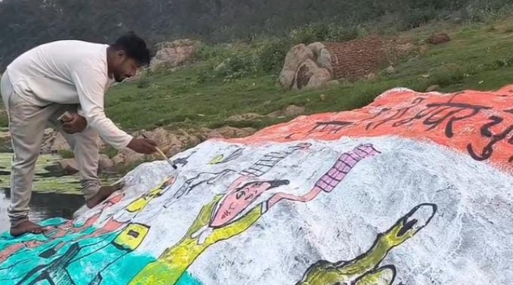 नदी किनारे चित्र बनाकर शहरवासियों को जागरूक कर रहे चित्रकार विशेंद्र नारायण सिंह