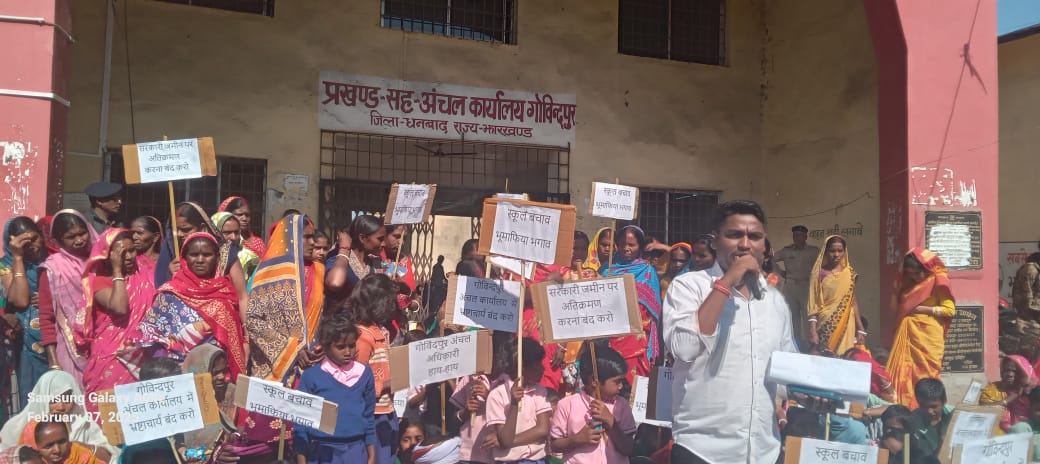 गोविंदपुर : गोविंदपुर अंचल कार्यालय के समक्ष जेबीकेएसएस के नेतृत्व में धरना प्रदर्शन किया गया। जिसमें स्कूली बच्चों के अलावा बड़ी संख्या में ग्रामीण भी मौजूद थे।