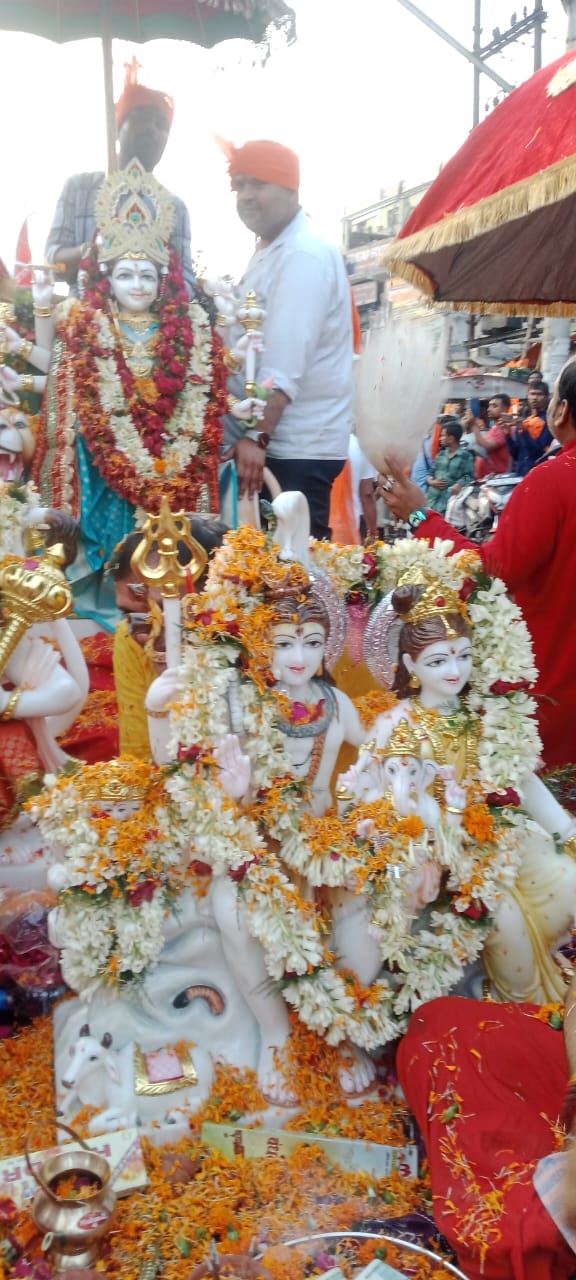 अवसर था जगत जननी मां दुर्गा के प्राण प्रतिष्ठा के चौथे दिन शनिवार शाम छठ तलाब में आयोजित गंगा आरती का। इसके पूर्व देवी विग्रह एवं विंध्याचल से ज्योत का बाजा गाजा के साथ नगर भ्रमण कराया गया।