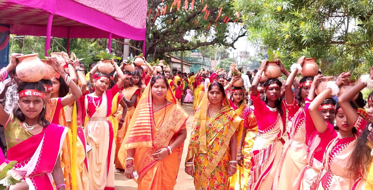 कलश यात्रा में पारंपरिक ढोल, ढाक के साथ डीजे में लोग नाचते गाते ब्राह्मण तालाब पहुंचे। वहां पंडित मानिक चक्रवर्ती, सपन चक्रवर्ती,तथा हीरालाल चक्रवर्ती के द्वारा पूजन कर कलश उठाया गया। तत्पश्चात जय हनुमान और जय श्री राम के जय घोष के साथ कलश यात्रा वापस संकट मोचन हनुमान मंदिर पहुंचे।