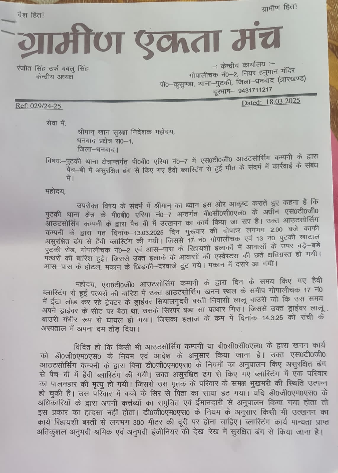 पुटकी। ग्रामीण एकता मंच के केंद्रीय अध्यक्ष रंजीत सिंह उर्फ बबलू सिंह ने गत दिनों एसटी जी कंपनी में हुई जानलेवा घटना को लेकर डी०जी०एम०एस० धनबाद को पत्र लिखा है ।जिसमे श्री सिंह ने कहा है कि बी० सी० सी० एल० के पीबी एरिया के अधीन संचालित एस०टी०जी० आउटसोर्सिंग कंपनी के द्वारा पैच-बी में उत्खनन का कार्य किया जा रहा है । जहां कंपनी के द्वारा 13 मार्च को लगभग 2:00 बजे दिन में काफी असुरक्षित ढंग से उच्च विस्फोट की गई जिससे आस पास के रिहायसी ईलाको मे बड़े-बड़े पत्थरों की बारिश हुई । आवासों की एस्वेस्टस की छतें क्षतिग्रस्त हो गयी । आसपास के होटलों एवं मकानों की खिड़की दरवाजे टूट गए मकान में दरारें आ गई ।