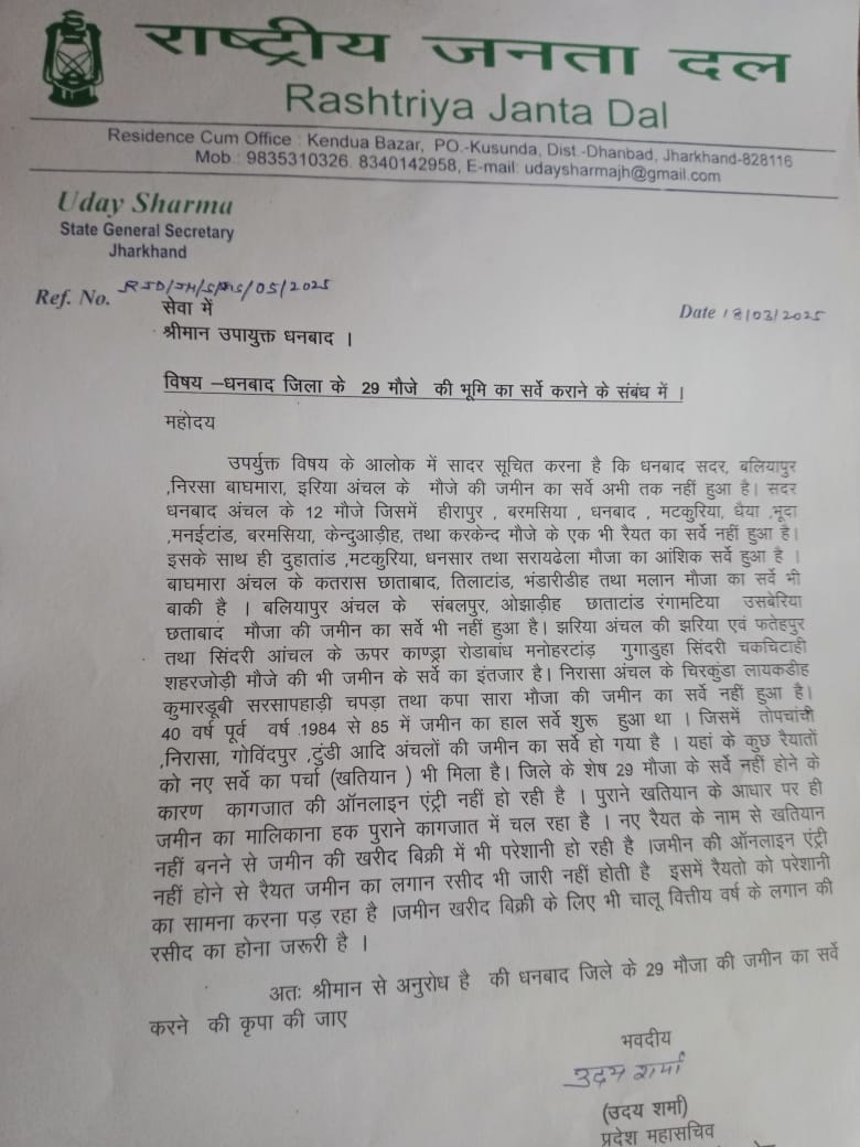 धनबाद -झारखंड प्रदेश राजद के प्रदेश महासचिव उदय शर्मा ने मंगलवार को उपायुक्त धनबाद को ज्ञापन सौंप कर जिले के 29 मौजे की भूमि का सर्वे कराने की मांग की है । श्री शर्मा ने पत्र में लिखा है कि धनबाद सदर, बलियापुर ,निरसा बाघमारा, इरिया अंचल के मौजे की जमीन का सर्वे अभी तक नहीं हुआ है ।.सदर धनबाद अंचल के 12 मौजे जिसमें हीरापुर , बरमसिया , धनबाद , मटकुरिया, धैया ,भूदा ,मनईटांड, बरमसिया, केन्दुआड़ीह, तथा करकेन्द मौजे के एक भी रैयत का सर्वे नहीं हुआ है । इसके साथ ही दुहाटांड ,मटकुरिया, धनसार तथा सरायढेला मौजा का आंशिक सर्वे हुआ है । बाघमारा अंचल के कतरास छाताबाद, तिलाटांड, भंडारीडीह तथा मलान मौजा का सर्वे भी बाकी है । बलियापुर अंचल के संबलपुर, ओझाड़ीह , छाताटांड रंगामटिया उसबेरिया छताबाद मौजा की जमीन का सर्वे भी नहीं हुआ है । झरिया अंचल की झरिया एवं फतेहपुर तथा सिंदरी अंचल के ऊपर काण्ड्रा, रोडाबांध, मनोहरटांड़ , गुगाडुहा, सिंदरी , चकचिटाही ,शहरजोड़ी मौजे की भी जमीन के सर्वे का इंतजार है । निरसा अंचल के चिरकुंडा , लायकडीह, कुमारडूबी, सरसापहाड़ी, चपड़ा तथा कपा सारा मौजा की जमीन का सर्वे नहीं हुआ है । 40 वर्ष पूर्व वर्ष 1984 से 85 में जमीन का हाल सर्वे शुरू हुआ था । जिसमें तोपचांची ,निरसा, गोविंदपुर ,टुंडी आदि अंचलों की जमीन का सर्वे हो गया है । यहां के कुछ रैयतों को नए सर्वे का पर्चा (खतियान ) भी मिला है । उन्होंने कहा है कि जिले के शेष 29 मौजा के सर्वे नहीं होने के कारण कागजात की ऑनलाइन एंट्री नहीं हो रही है । पुराने खतियान के आधार पर ही जमीन का मालिकाना हक पुराने कागजात में चल रहा है । नए रैयत के नाम से खतियान नहीं बनने से जमीन की खरीद बिक्री में भी परेशानी हो रही है । जमीन की ऑनलाइन एंट्री नहीं होने से रैयत जमीन का लगान रसीद भी जारी नहीं होती है इसमें रैयतो को परेशानी का सामना करना पड़ रहा है । जमीन खरीद बिक्री के लिए भी चालू वित्तीय वर्ष के लगान की रसीद का होना जरूरी है । उन्होंने धनबाद जिले के 29 मौजा की जमीन का सर्वे यथाशीघ्र कराने की माँग उपायुक्त से की है ।