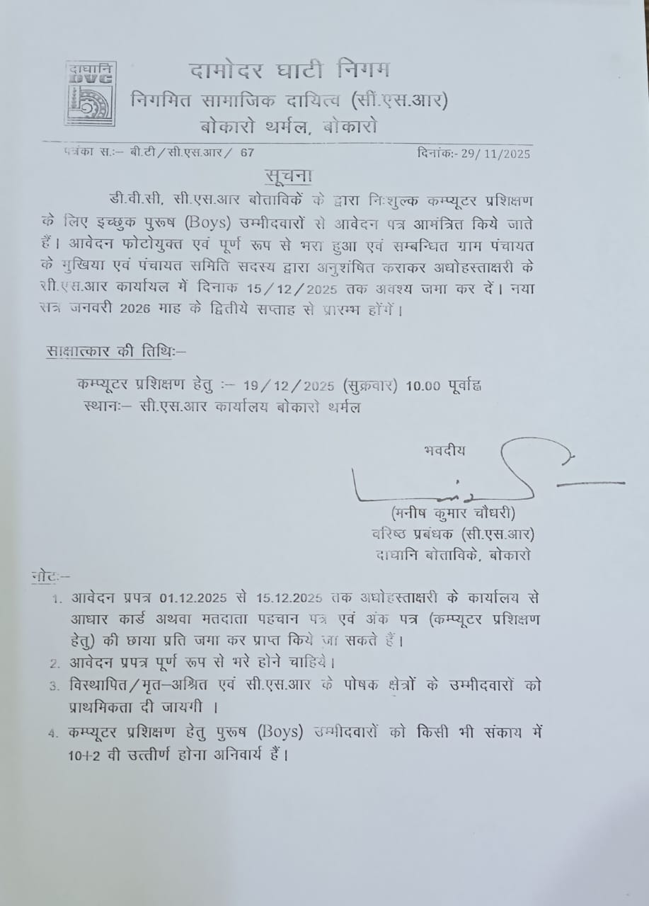 डीवीसी सीएसआर के द्वारा बोकारो थर्मल एवं आसपास क्षेत्र के महिला, पुरुष, युवकों एवं लड़कियों के लिए निःशुल्क कंप्यूटर एवं सिलाई प्रशिक्षण देने का आवेदन पत्र निकाला गया है। आवेदन फोटो युक्त एवं पूर्ण रूप से भर कर सीएसआर कार्यालय बोकारो थर्मल में जमा करना है जिसमें संबंधित ग्राम पंचायत के मुखिया एवं पंचायत समिति सदस्य द्वारा अनुशंसित करना है। महिलाओं और लड़कियों के सिलाई प्रशिक्षण हेतु 17 दिसंबर को सुबह 10 बजे एवं कंप्यूटर प्रशिक्षण हेतु 18 दिसंबर को सुबह 10 बजे साक्षात्कार एवं युवकों के लिए कंप्यूटर प्रशिक्षण हेतु 19 दिसंबर को सुबह 10 बजे साक्षात्कार रखी गई है। आवेदन फार्म लेने के लिए आधार कार्ड अथवा मतदाता पहचान पत्र एवं 10वीं व 12वीं की अंक प्राप्त की छाया कॉपी जमा करना है।