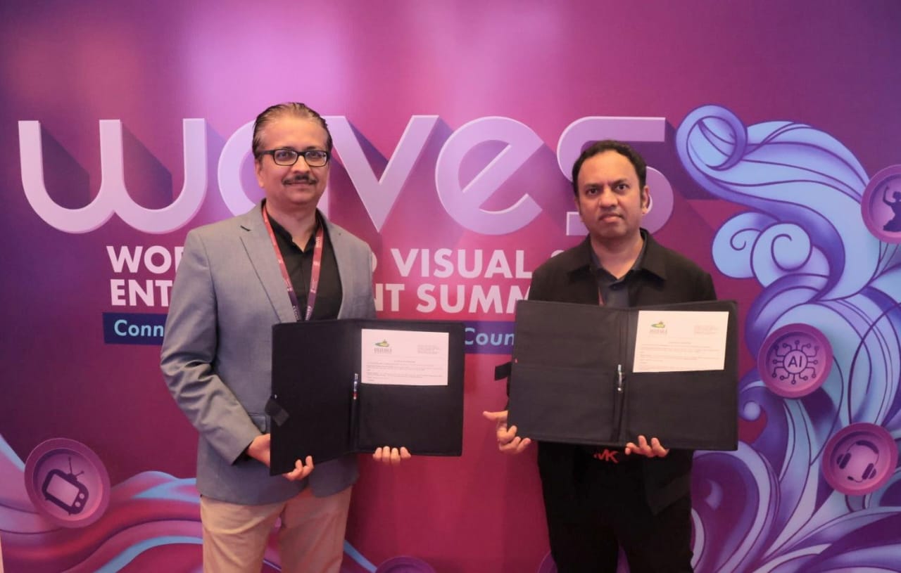 चांडिल :पश्चिम रेलवे के मुख्य जनसंपर्क अधिकारी श्री विनीत अभिषेक और छोटा भीम के क्रियेटर श्री राजीव चिलाकलापुडी, WAVES 2025, जियो वर्ल्ड सेंटर, मुंबई में लेटर ऑफ कोलेबरेशन का आदान-प्रदान करते हुए।